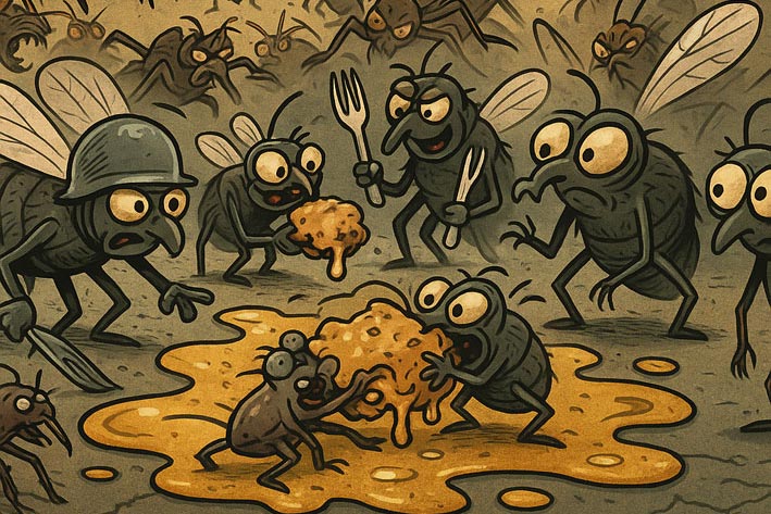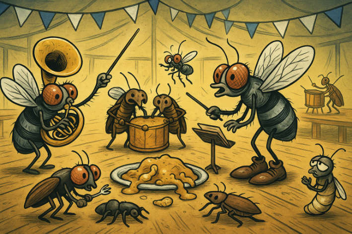 Am Trottoir flackan drei Larifari, oan hams oobissn, daneem bappt a Nosnramme. Weiße, greane und braune Glasscherm lieng aa umanand, zwoa Oachkatzlschwoafin, a Dingolfing, a Holz-vor-der-Hüttn im Miniaturformat als Anhänger von am Schlissl und a Zigarrettn, wo no a greana Lunganharing drobappt. Zwoa Wrdlbrmft und a oafchacherner Zwiefacher lieng aa dabei. Arschlings sihgt mer a oroschne Lackn Gschpeiberts. Und überoi flackan Zibebn und griebner Kren. Des, sog i, des duasd amal promptn und na lasst des vo der KI fotografiern!“