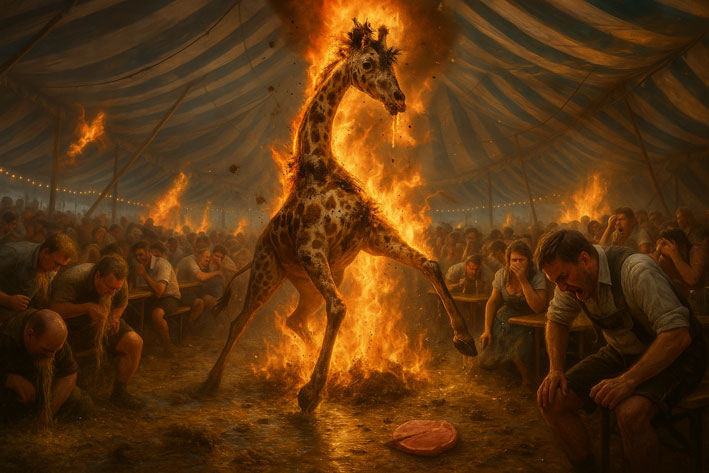 Mache ein querformatiges Ölgemälde folgenden Inhalts: da öffnen sich die Wolken und mit blinzelnden Augen treten achtzehn Packträger hervor und verkünden das Ende der Welt.Links und rechts stehen je vier goldene Jungfrauen mit Semmelbrösel bepappt und halten ein vernickeltes Butterbrot in der Hand. Die Luft zitterte wie Schweinesulz, die Erde wühlte sich auf, die Vesuve speiten Honig und Sauerkraut, Nacht- und Tageulen, Glühwürmchen und Lämmergeier schwirrten gespensterhaft auf dem Fußboden umher, panikartig zerplatzte ein alter Leberkäse.